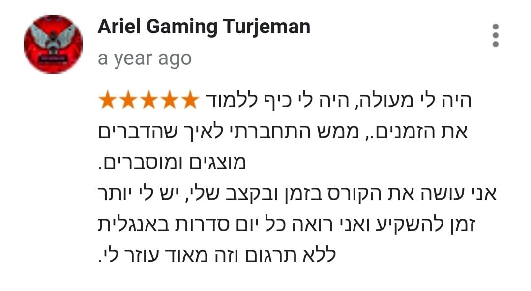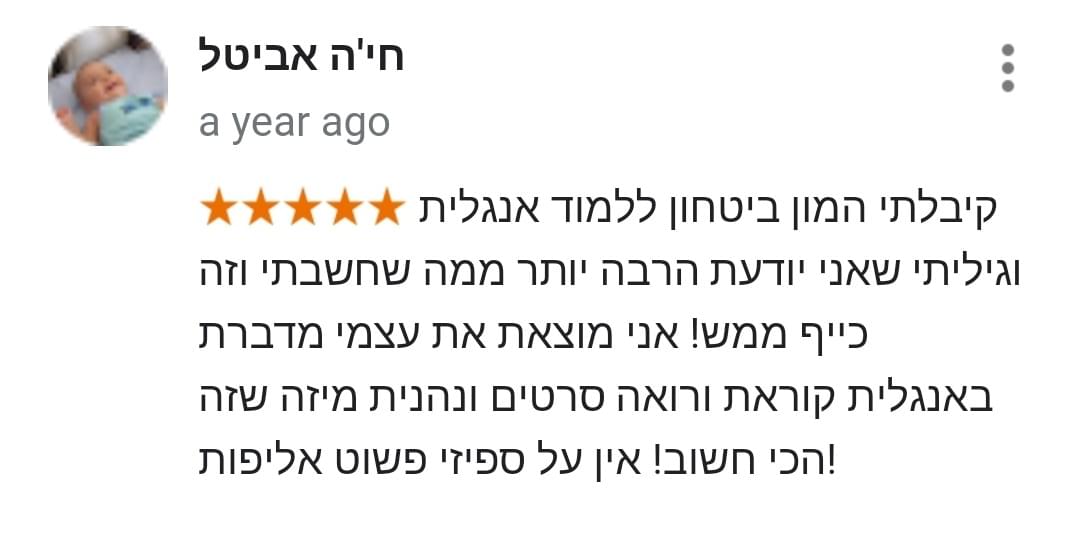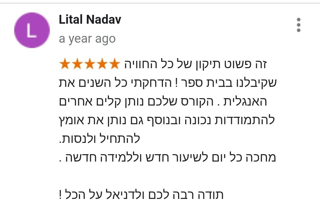 השיטה היחידה בישראל שהוכיחה את עצמה על מעל 17,433 תלמידים שהצליחו ללמוד אנגלית ב 42 יום, גם בלי "קליטה לשפות" בלי צורך לשנן מילים משעממות, ובלי להתעסק בלמידת דקדוק מיותר שגם אמריקאי ממוצע לא יודע…